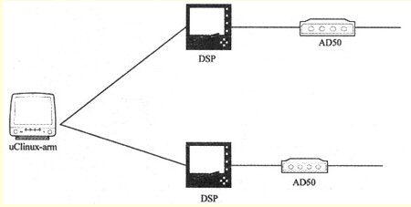 下一代媒體網(wǎng)關(guān)系統(tǒng)主要由媒體網(wǎng)關(guān)、媒體網(wǎng)關(guān)控制器和信令網(wǎng)關(guān)組成,實現(xiàn)了功能上的分解。為了適應(yīng)不同的網(wǎng)絡(luò),本文主要介紹了媒體網(wǎng)關(guān)的實現(xiàn)方法,其中媒體網(wǎng)關(guān)的主要作用是實現(xiàn)模擬信號由電路交換轉(zhuǎn)換成數(shù)字信號PCM編碼,并進(jìn)行G.711或者G.723等格式編碼。為了實現(xiàn)媒體網(wǎng)關(guān),整個系統(tǒng)由3部分組成,包括基于ARM架構(gòu)的嵌入式系統(tǒng)(uClinux)、語音信號轉(zhuǎn)換芯片(TLC320AD50)和定點數(shù)字信號處理器(TMS320VC54xx),如圖3所示。