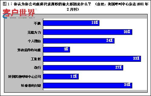 圖1是美國呼叫中心的調查結果。從顯示的結果來看,辭職的最大原因是工資低,其次是升職機會少。其中為了從事其他職業(yè)而辭職的占27%,要轉到別的客服中心工作的占12%?吹竭@個結果之后,發(fā)現(xiàn)即使在美國,客服中心有關人員也沒有得到相應的待遇。