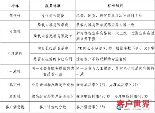 為了使電子渠道的服務(wù)標(biāo)準(zhǔn)貼近客戶的需求,使內(nèi)部的質(zhì)量監(jiān)測(cè)結(jié)果與客戶滿意度相一致,制定一套客戶化的服務(wù)標(biāo)準(zhǔn)至關(guān)重要。我們首先從客戶調(diào)研出發(fā),了解客戶對(duì)電子渠道的服務(wù)過(guò)程中關(guān)注的關(guān)鍵指標(biāo)。通過(guò)調(diào)研發(fā)現(xiàn),客戶對(duì)電子渠道的服務(wù)質(zhì)量通常從:簡(jiǎn)便性、可靠性、可理解性、及時(shí)性、穩(wěn)定性、一致性等六個(gè)方面進(jìn)行感受和評(píng)價(jià)。因此我們將客戶關(guān)注的關(guān)鍵指標(biāo)進(jìn)行內(nèi)化,制訂了以下幾個(gè)方面的服務(wù)標(biāo)準(zhǔn):