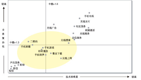 諾基亞西門子通信借鑒國外的無限增值業(yè)務(wù)經(jīng)驗和對國內(nèi)運(yùn)營商業(yè)務(wù)的分析提出“技術(shù)困難度—業(yè)務(wù)復(fù)雜性”模型來詮釋無線增值業(yè)務(wù)。