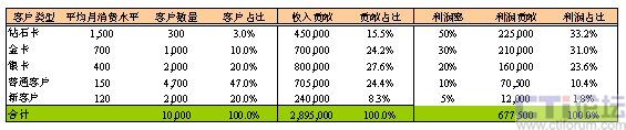 同時,如下表2所示,我們給定了不同客戶分群的客戶平均月消費水平及利潤貢獻(xiàn)比率。通過計算可以得出,高端的鉆石卡客戶雖然僅占客戶數(shù)的3%,貢獻(xiàn)了收入的15.5%,卻貢獻(xiàn)了三分之一的利潤。而占近半數(shù)的普通客戶,大約貢獻(xiàn)了收入的四分之一,僅僅貢獻(xiàn)了利潤了10%左右。在一些行業(yè)中,服務(wù)和交易成本所占比重較高,普通客戶群甚至有可能會帶來負(fù)利潤。