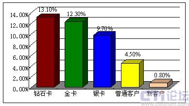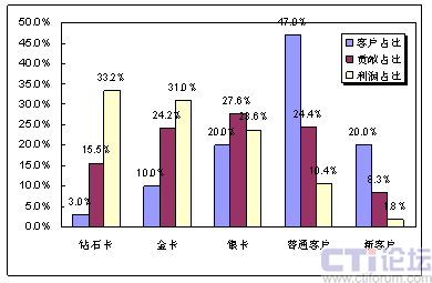 因為高端客戶在利潤貢獻(xiàn)中所起的巨大作用,通過簡單的計算即可得出,每一名鉆石卡客戶流失帶來的利潤損失,相當(dāng)于9.4名銀卡客戶流失帶來的損失,或相當(dāng)于50名普通客戶流失帶來的損失,或相當(dāng)于125名新用戶流失帶來的直接損失。