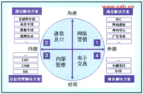 企業(yè)客戶對(duì)電信服務(wù)的需求,集中體現(xiàn)為實(shí)現(xiàn)企業(yè)商業(yè)過程的綜合通信信息整體服務(wù),具體可以按縱向溝通、經(jīng)營(yíng)和橫向內(nèi)部、外部分為四部分:內(nèi)部員工溝通、內(nèi)部經(jīng)營(yíng)管理、外部客戶營(yíng)銷以及產(chǎn)品銷售實(shí)現(xiàn)。與之相對(duì)應(yīng)的需求如圖2所示。