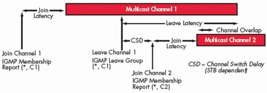 TV節(jié)目通常采用組播方式進(jìn)行傳送。組播是一種允許一個(gè)或多個(gè)發(fā)送者(組播源)一次同時(shí)發(fā)送單一的數(shù)據(jù)包到多個(gè)接收者的網(wǎng)絡(luò)技術(shù)。組播源把數(shù)據(jù)包發(fā)送到特定組播組,而只有屬于該組播組的地址才能接收到數(shù)據(jù)包。在IPTV里,組播源往往僅有一個(gè),即使用戶數(shù)量成倍增長(zhǎng),主干帶寬也不需隨之增加,因?yàn)闊o(wú)論有多少個(gè)目標(biāo)地址,在整個(gè)網(wǎng)絡(luò)的任何一條主干鏈路上只傳送單一視頻流,即所謂“一次發(fā)送,組內(nèi)廣播”。組播提高了數(shù)據(jù)傳送效率,減少了主干網(wǎng)出現(xiàn)擁塞的可能性。對(duì)于TV系統(tǒng)而言,其所能夠支持的用戶數(shù)目?jī)H僅受到接入網(wǎng)絡(luò)能力的限制,與前端推送系統(tǒng)的推送能力無(wú)關(guān)。因此,TV業(yè)務(wù)性能的主要測(cè)試指標(biāo)包括所推送的最大頻道數(shù)目、頻道平均帶寬、平均頻道切換時(shí)間、I幀加入延時(shí)、平均頻道離開(kāi)延時(shí)、平均頻道加入延時(shí)、頻道重疊時(shí)間和頻道間隔時(shí)間。
