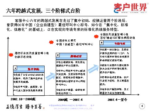 六年的跨越式發(fā)展,走過了集中初始,規(guī)模運營兩個階段。曾經(jīng)獲得也是今天主辦方的06年中國(企業(yè)自建型)最佳呼叫中心稱號。如今在集中化、標準化、信息化的基礎(chǔ)上,正在向?qū)>專席標準化的熱線服務轉(zhuǎn)型。