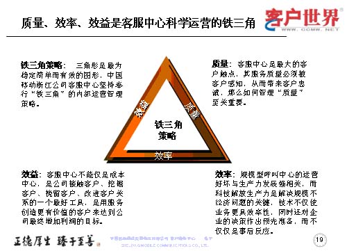 應該說這三個方面是科學運營的一個鐵三角,這是我們的理解,因為三角形,始終認為是最穩(wěn)定、簡單、有效的圖形,也是我們在進行內(nèi)部運營的管理鐵架。質(zhì)量是客服中心最大的觸點當中被客戶感知,從而帶來客戶忠誠的,如何管理質(zhì)量,那就至關(guān)重要。效率尤其是規(guī)模型的呼叫中心的運營好壞,是與生產(chǎn)力的發(fā)展強相關(guān),而科技解放生產(chǎn)力是解決規(guī)模問題的關(guān)鍵。技術(shù)不僅是運行更具效益率,同時還對企業(yè)的決策作出預先準備,而不僅僅是事后反應。很多年來,更多的企業(yè)是把客服中心視為成本中心,而事實上,效益的顯現(xiàn)讓我們陸續(xù)地走出了成本中心,它應該是公司接觸客戶、挖掘客戶、挽留客戶、改進客戶關(guān)系的一個最好工具,是用服務創(chuàng)造更有價值的客戶,來達到公司最終增加利潤的目標。