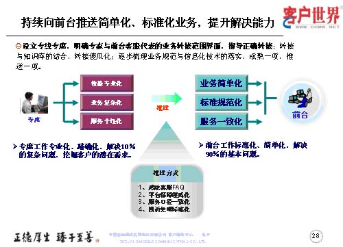 設(shè)立專線專席,并不是指專線越專越多,而是持續(xù)地向前臺推送簡單化、標準化的業(yè)務,提升前臺一線的解決能力,所以我們重點以專線的技能專業(yè)化、業(yè)務復雜化、服務個性化,然后把簡單的形成規(guī)范標準的業(yè)務向前臺推送,保障專席的工作是專業(yè)化、精確化地解決10%的復雜問題,從而更多地去挖掘客戶的需求。而前臺客服的工作是用標準化、簡單化地解決90%的基本問題。