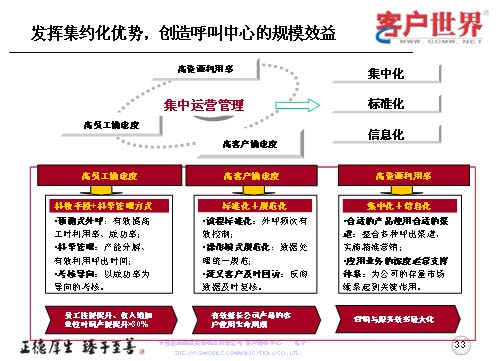作為集中管理來講,突出“三高”,運用好“三高”體現(xiàn)的是如何進行集中化、標準化和信息化。我們從高員工滿意度,高客戶滿意度和高資源利用率入手,高員工滿意度主要是應用平臺和科學的管理方法,使得員工的技能持續(xù)提升,員工的自身收入也按單位時間而增長;高客戶滿意度是用標準化和規(guī)范化來進一步優(yōu)化流程,改進操作,對于目標客戶及時回訪,有效地延長公司產(chǎn)品的客戶使用生命周期,以創(chuàng)造公司的最大利益;作為集中化的呼叫中心,系統(tǒng)已經(jīng)投入了較大的座席規(guī)模,高資源利用率是如何把這些座席和系統(tǒng)的規(guī)模應用得更好,使得我們的產(chǎn)品能夠進一步地推向市場,被客戶所接受,所以我們采取了更多的整合呼出渠道,精確營銷,尤其對公司的存量客戶進行持續(xù)維系的關(guān)鍵時刻,達到營銷與服務效率的最大化。