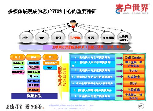 世界上卓越的企業(yè)無所不在,在客戶戰(zhàn)略上最具創(chuàng)新能力的企業(yè),奠定起的競爭,也會越來越出體現(xiàn)在客戶關(guān)系管理上,隨著數(shù)據(jù)業(yè)務成為運營商的主流業(yè)務,呼叫中心在服務、營銷、渠道管理等方面的戰(zhàn)略地位會日益重要,隨著客戶接觸的不斷增長,呼叫中心將逐漸演變成客戶接觸中心、互動中心,乃至包括實體渠道之外的各種電子渠道,任重而道遠。