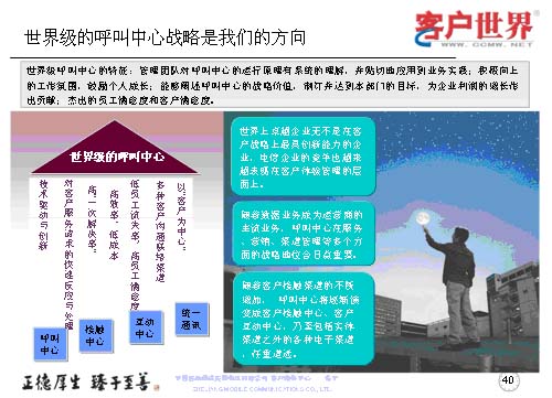 最后我想世界級的呼叫中心戰(zhàn)略是我們從事客戶服務行業(yè),從事呼叫中心人的方向,從我們理解的世界級呼叫中心特征來講,管理團隊應對呼叫中心的運營原理有系統(tǒng)的理解,并貼切地應用到業(yè)務實踐,創(chuàng)造積極向上的工作氛圍,鼓勵員工成長,能夠闡述呼叫中心的戰(zhàn)略價值,制訂并達到本部門的目標,為企業(yè)利潤的增長作出杰出的貢獻,杰出的員工滿意度和客戶滿意度。所以世界級呼叫中心我們理解是從七個方面來衡量,以“客戶為中心”,多種客戶溝通的聯(lián)絡渠道,低員工流失率和高客戶滿意度,高效率、低成本,高“一次性解決率”,對客戶服務請求的快速反應與處理,技術(shù)驅(qū)動與創(chuàng)新。