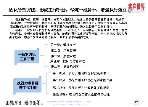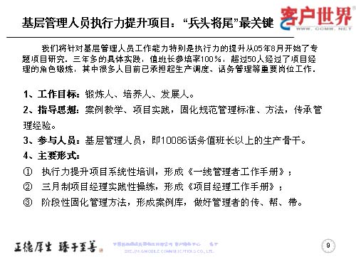大家知道基層管理人員其實是兵頭將尾的最關(guān)鍵,我們將對基層管理人員的工作能力,特別是執(zhí)行力的提升是從05年8月份就開始了專項研究,三年多的具體實踐,值班長的培訓率達到100%,超過50人經(jīng)過了項目經(jīng)理的角色鍛煉,目前很多擔任過項目經(jīng)理的已經(jīng)承擔了生產(chǎn)調(diào)度、話務管理等重要的管理崗位。在這個項目當中,我們從四個方面入手,工作目標是鍛煉人、培養(yǎng)人、發(fā)展人。指導思想是案例教育、項目實踐,固化規(guī)范管理標準、方法,傳承管理經(jīng)驗。參與人員就是基層管理人員,話務值班長以上的生產(chǎn)骨干。我們主要運用的形式是執(zhí)行力提升項目系統(tǒng)培訓,形成了《一線管理者工作手冊》。三月制項目經(jīng)理的實踐操練,通過競聘的方式產(chǎn)生,形成了《項目經(jīng)理工作手冊》。階段性的固化-優(yōu)化-再固化的管理方法,形成案例庫,做好管理者的傳幫帶。