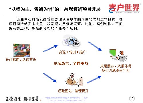 這個管理咨詢項目開展中,是以我為主,咨詢?yōu)檩o的非常規(guī)咨詢項目,打破的是以外腦為主的常規(guī)運作模式,在項目初期就有大量的一線管理人員參與調(diào)研、討論、案例制作、手冊編制,是名副其實的“我要”項目。那么在這個方面我們分成了三部曲,設(shè)計標準、達成共識,通過實驗加培訓推廣,以我為主的全程參與,來固化經(jīng)驗,提升管理。最后成果展示,效果體現(xiàn)于執(zhí)行力,彰顯出生產(chǎn)力。