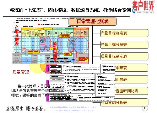 我們精煉了這么七張表的方式,運用三個維度:產(chǎn)量管理、質(zhì)量管理和團隊與信息管理,而這些基礎(chǔ)數(shù)據(jù)都來自于系統(tǒng),教學和案例。而七張表是從產(chǎn)量、質(zhì)量和團隊信息來展現(xiàn)出具體的一些應用,將一線管理人員從日常工作的三個維度入手,形成七張表管理模式,很好地具備了操作標準和規(guī)范。這模板表除了系統(tǒng)出來的一些數(shù)據(jù)以外,通過我們基層管理人員的項目執(zhí)行和跟蹤檢查,形成一些案例,改進計劃和改進意見。這幾張表多為系統(tǒng)自身所產(chǎn)生一些具體的數(shù)據(jù),比如說上個月的指標值如何設(shè)定,實際達成的產(chǎn)量怎樣,回訪滿意率具體有哪些數(shù)據(jù),都在客服系統(tǒng)的報表中提煉出來的相關(guān)數(shù)據(jù)。
