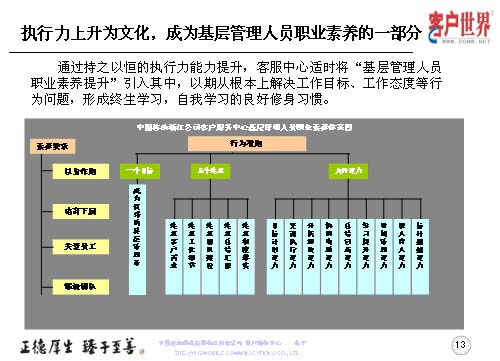在執(zhí)行力上升文化的同時,基層管理者的職業(yè)素養(yǎng)是我們時刻去追求的,所以客服中心適時地將基層管理人員的職業(yè)素養(yǎng)引入到其中,以期從根本上解決工作目標、工作態(tài)度等問題,形成終生學習,自我學習的良好修身習慣。這是我們客服中心基層管理人員職業(yè)素養(yǎng)的一個體系圖,首先從素養(yǎng)要求的四個維度,行為準則的一、五、九來展現(xiàn)。一個目標是成為優(yōu)秀的管理者,五個注重是注重客戶需求、注重工作細節(jié)、注重團隊建設(shè)、注重總結(jié)匯報、注重制度落實。九種能力:目標計劃能力,貫徹執(zhí)行能力、分析解決能力、協(xié)調(diào)溝通能力、總結(jié)創(chuàng)新能力、時間管理能力、師人育人能力和標桿超越能力。這個一、五、九,讓它彰顯出素養(yǎng)和表現(xiàn)的四個維度,以身作則、培育下屬、關(guān)愛員工和鍛造團隊。