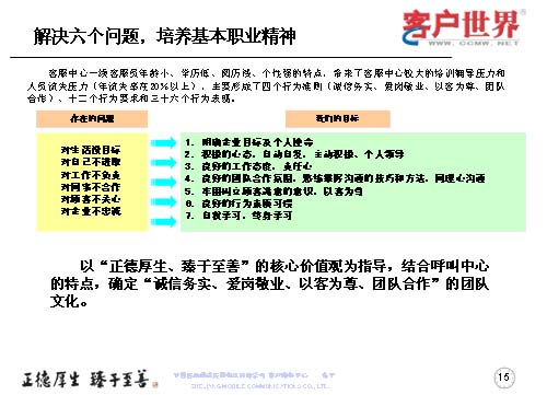 一線客服人員如何來全面提升職業(yè)能力,首先是解決一線客服人員的六個問題,剛才已經(jīng)跟大家交流了客服中心一線人員的人員結(jié)構(gòu),當前的六個主要問題可以用簡單的幾個方面來表述:對生活沒有明確的目標、對自己不進取、對工作不負責、對同事不合作、對顧客不關(guān)心、對企業(yè)不忠誠,這是在日常工作中,一線人員所存在的問題。而針對這些問題,我們要用工作目標去持續(xù)解決和克服問題,所以我們采取的是讓大家明確企業(yè)目標與個人使命,用積極的心態(tài)自主自發(fā),主動積極和個人領(lǐng)導;良好的工作態(tài)度責任心,良好的團隊合作氛圍;熟練掌握溝通技巧和方法,牢固樹立顧客滿意的意識,以客為尊;良好的行為素質(zhì)習慣,自我學習,終身學習。從而在中國移動集團“正德厚生、臻于至善”的核心價值觀指導下,結(jié)合呼叫中心特點,確定誠實務信,愛崗敬業(yè),以客為尊、團隊合作的團隊文化。