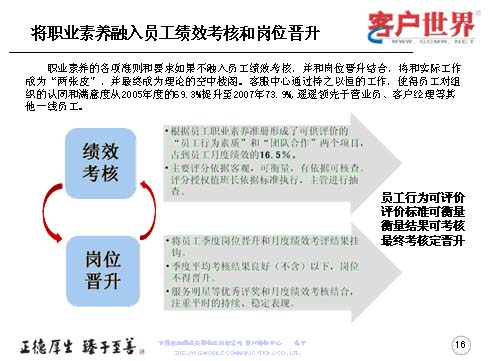 職業(yè)素養(yǎng)不是說在嘴上,講在課上,而是更多地融入到員工的績效考核于崗位晉升當中。以解決工作素養(yǎng)要求和實際工作的兩張皮,以及使得客服理念成為理論的空中樓閣。所以我們是持之以恒地開展一線員工組織認同滿意度調(diào)查,我們每年都會做一線客服人員的滿意度調(diào)查,在滿意度調(diào)查當中,從05年的69.3%,提升到07年的73.9%,而且遙遙領(lǐng)先于營業(yè)員和客服經(jīng)理。而在績效考核中主要把員工行為素質(zhì)、團隊合作占到了員工月度績效的16.5%,使大家認識到作為一個組織中的一員,作為團隊我們是為了一個共同的目標,彼此依賴、彼此信任,同時也要強化績效來管理。所以主要的評分依據(jù)是客觀、可衡量、有依據(jù)可查,同時也把這些也作為客服人員季度晉升和月度績效考評掛鉤,如果該員工季度的平均考核在良好以下的話,將得不到晉升,最終實現(xiàn)的是員工行為可評價,評價標準可衡量,衡量結(jié)果可考核,最終考核定晉升。
