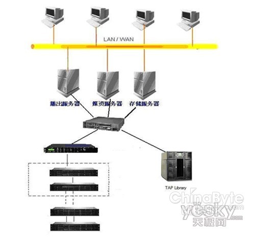 2. 流媒體服務(wù)器連接存儲(chǔ)服務(wù)器,使用SAN結(jié)構(gòu),預(yù)計(jì)12TB的容量