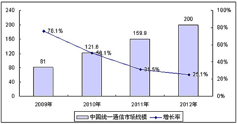 賽迪顧問預測,伴隨著全球經(jīng)濟的逐漸復蘇和企業(yè)對統(tǒng)一通信產(chǎn)品認識與需求的持續(xù)增長,2009年中國統(tǒng)一通信市場將出現(xiàn)加速增長的趨勢,全年市場規(guī)模將達81億元,同比增長76.1%,至2012年,中國統(tǒng)一通信整體市場規(guī)模將達200億元,平均年增長率超過30%。