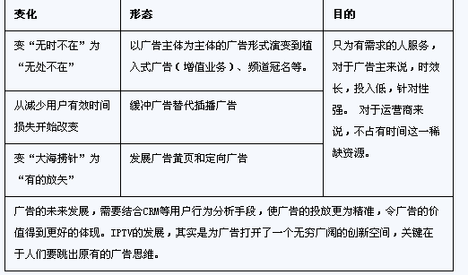 IPTV在短期內(nèi)的屬性還著重于電視媒體,在收入上偏向于后向媒體模式,通過用戶的流量來(lái)帶動(dòng)后向廣告價(jià)值。借助IPTV的互動(dòng)特性和頻道資源的豐富性,以空間來(lái)?yè)Q取稀缺的時(shí)間資源。