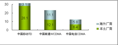 在3G設(shè)備市場方面,2008年,中國的WCDMA、CDMA2000與TD-SCDMA三種3G網(wǎng)絡(luò)在建設(shè)上有不同的進展。中國移動啟動了第二階段的TD-SCDMA網(wǎng)絡(luò)建設(shè)、中國電信啟動了涉及面向81個重點城市的CDMA全網(wǎng)招標(biāo)、而中國聯(lián)通也開始7個城市建立WCDMA試驗網(wǎng)絡(luò)的建設(shè)工作。而在所有的網(wǎng)絡(luò)建設(shè)中,中國本土廠商借3G契機迅速提升競爭力,占據(jù)了3G網(wǎng)絡(luò)建設(shè)大部分市場份額。