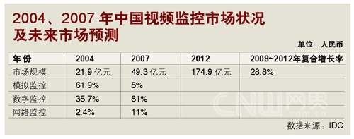 IDC的數(shù)字同樣樂觀。跟據(jù)IDC在2008年的預(yù)測,2008~2012年,中國視頻監(jiān)控市場的年均復(fù)合增長率將達(dá)28.8%,遠(yuǎn)高于IT市場投入的平均增長率。而在模擬、數(shù)字與IP模式(即網(wǎng)絡(luò)監(jiān)控)組成的視頻監(jiān)控市場里,IP的增長率又將高于前二者,成為市場增長的強(qiáng)勁動力!保ㄗⅲ耗M監(jiān)控是指圖像信號在采集后,通過模擬信號傳輸?shù)姆忾]式視頻監(jiān)控系統(tǒng)模式;數(shù)字監(jiān)控是指圖像信號在采集后,經(jīng)過編碼轉(zhuǎn)化成數(shù)字信號再進(jìn)行傳輸?shù)姆忾]或半封閉式視頻監(jiān)控系統(tǒng)模式;網(wǎng)絡(luò)監(jiān)控是指系統(tǒng)建立在以網(wǎng)絡(luò)為基礎(chǔ)的傳輸平臺的開放式視頻監(jiān)控系統(tǒng)模式)。