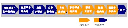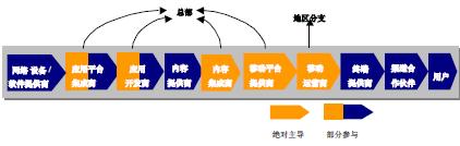 和記電訊是香港最大的流動(dòng)網(wǎng)絡(luò)運(yùn)營(yíng)商。2004年1月,和記電訊率先在香港推出世界級(jí)的3G服務(wù)。其目標(biāo)就是成為最佳的3G移動(dòng)通信多媒體通信運(yùn)營(yíng)商。和記電訊在產(chǎn)業(yè)鏈上承擔(dān)的角色如圖3所示。