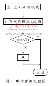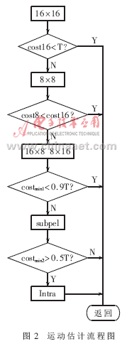 (4)算法替代和改進(jìn)。幀間預(yù)測的改進(jìn):關(guān)于算法的改進(jìn)主要集中在對me(motion estimation)的改進(jìn)上,流程如圖2所示。costmin1=min(cost16,cost8,cost16×8,cost8×16),costmin2=min(costmin1,costsub),依次在16×16、8×8、16×8和8×16大小宏塊的整像素位置做預(yù)測,再做次像素估計(jì)和幀內(nèi)預(yù)測,選用匹配準(zhǔn)則函數(shù)(采用sad作為匹配準(zhǔn)則函數(shù))取得最小值的模式進(jìn)行編碼。每計(jì)算一種模式,都將sad值與一個(gè)經(jīng)驗(yàn)閥值做比較。當(dāng)sad值小于這個(gè)閥值時(shí),立即結(jié)束運(yùn)動(dòng)估計(jì),從而減少運(yùn)算量。