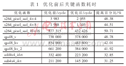 采用以上優(yōu)化方法對編碼關(guān)鍵函數(shù)進(jìn)行優(yōu)化,優(yōu)化前后函數(shù)耗時(shí)如表1所示?梢,以上優(yōu)化方法能大幅度減少編碼時(shí)間。