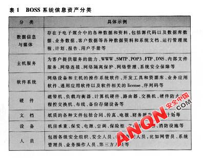 BOSS系統(tǒng)涉及的信息繁多,如何保護關(guān)鍵的數(shù)據(jù)不被泄漏是運營商非常重視的一個問題。信息分級用來評估運營商是否建立了信息資產(chǎn)管理的規(guī)范,明確了信息資產(chǎn)的內(nèi)容和級別,制定了有效的安全保護措施,如果沒有,應該明確BOSS系統(tǒng)內(nèi)的關(guān)鍵信息資產(chǎn)并列出清單,依據(jù)國家保密級別制定科學的信息資產(chǎn)分級標準,并作為風險評估的依據(jù)。參照國際信息系統(tǒng)安全標準BS7799/ISO17799對信息資產(chǎn)的描述和定義,可以將BOSS系統(tǒng)信息資產(chǎn)按照表1的方法進行分類。