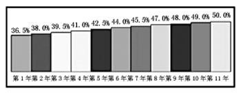 除了分檔包月的語音套餐,KDDI還根據(jù)消費(fèi)者的不同需求提供了多樣折扣優(yōu)惠,其中包括在網(wǎng)時(shí)長優(yōu)惠、家庭優(yōu)惠、個(gè)人優(yōu)惠、學(xué)生優(yōu)惠等多種方式(圖1)。多樣優(yōu)惠折扣方式之間也可以通過組合產(chǎn)生新的優(yōu)惠折扣內(nèi)容。例如:在網(wǎng)時(shí)長優(yōu)惠與家庭優(yōu)惠共享的套餐在入網(wǎng)的第1年優(yōu)惠折扣達(dá)到40%,此后每續(xù)約1年將增加1%的折扣優(yōu)惠,逐年累積下來,在第11年將享受高達(dá)50%的優(yōu)惠折扣(圖2)。時(shí)段優(yōu)惠套餐中體現(xiàn)分時(shí)段優(yōu)惠,區(qū)分忙時(shí)、閑時(shí),周末時(shí)間和工作時(shí)間,分別定價(jià)。例如,同樣是9500日元的套餐檔次,在時(shí)段優(yōu)惠套餐中,周末白天(閑時(shí))的資費(fèi)是每分鐘10日元,而在非時(shí)段優(yōu)惠的普通套餐中,每分鐘的資費(fèi)是24日元,可見在網(wǎng)絡(luò)閑時(shí)可以享受更多的資費(fèi)優(yōu)惠。而針對學(xué)生和老人設(shè)計(jì)的套餐也能享受比普通套餐更優(yōu)惠的資費(fèi),這就體現(xiàn)了區(qū)別細(xì)分市場的差異化定價(jià)。
