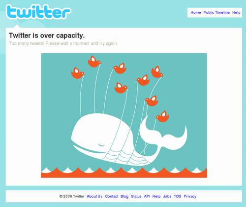 當(dāng)Twitter宕機(jī)或者訪問(wèn)量超過(guò)負(fù)荷時(shí),用戶會(huì)被導(dǎo)向一個(gè)顯示有“失落的鯨魚(yú)”的頁(yè)面