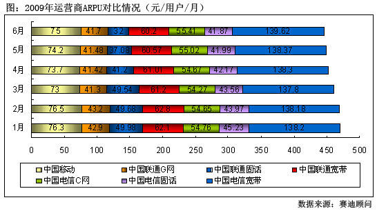2009年,運營商移動ARPU值較2008年有較大下滑。電信運營市場目前主要收入來源依然是語音業(yè)務(wù),占據(jù)比例超過60%,而語音業(yè)務(wù)收入的增長放緩,電信資費水平不斷下降,使得用戶ARPU值也隨之逐漸下降。
