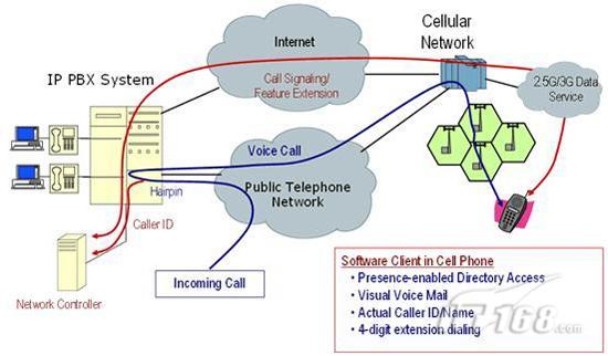 Sprint-Nextel最近推出了一種運(yùn)用Femtocells技術(shù)、類(lèi)似cFMC的解決方案,稱為Airave。按照這個(gè)方案,用戶把蜂窩通信網(wǎng)絡(luò)的一個(gè)小型基站同基地的寬帶互聯(lián)網(wǎng)連接在一起。如圖1所示,這兩種方案都是利用寬帶互聯(lián)網(wǎng)和蜂窩通信網(wǎng)絡(luò)其中之一實(shí)現(xiàn)Voip,不同的區(qū)別只是本地的無(wú)線連接是運(yùn)用Wi-Fi技術(shù)還是蜂窩通信網(wǎng)絡(luò)。對(duì)企業(yè)用戶而言,主要缺點(diǎn)是,這兩種實(shí)現(xiàn)方式提供的都是由用戶主導(dǎo)的單一語(yǔ)音服務(wù),而沒(méi)有面向企業(yè)PBX或移動(dòng)UC系統(tǒng)的接口。