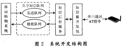 基于開發(fā)周期及成本的考慮,本系統(tǒng)采用開發(fā)包形式。短信貓開發(fā)包是針對目前常用短信模塊開發(fā)的短信應用API集合,具有成熟穩(wěn)定、支持多種語言、高可靠性等特點特點。系統(tǒng)開發(fā)結(jié)構(gòu)圖如圖2所示。
