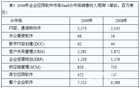 在Gartner的統(tǒng)計(jì)中,SaaS領(lǐng)域中,除了CRM之外,內(nèi)容、通訊和協(xié)作市場(chǎng)同樣表現(xiàn)不俗,在2009年,這一市場(chǎng)的銷售收入將從2008年的21.4億美元增長(zhǎng)到26億美元,甚至超過(guò)了CRM分市場(chǎng)的23億美元。其他如ERP分市場(chǎng)等同樣占據(jù)不小的份額。