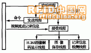 在軟件設(shè)計(jì)方面包括兩部分,一部分是監(jiān)控終端的監(jiān)控軟件,另一部分是各便件的底層軟件。監(jiān)控終端采用了多線程的軟件設(shè)計(jì)方法,系統(tǒng)對連接的每一個(gè)監(jiān)控點(diǎn)共采用了6個(gè)線程,即網(wǎng)絡(luò)監(jiān)聽線程、發(fā)送線程、接受線程、H.26 3圖像解碼顯示線程、圖像保存線程和記錄信息(門口終端的撥號(hào)、門禁一卡通等記錄信息)檢測線程,如圖4所示。