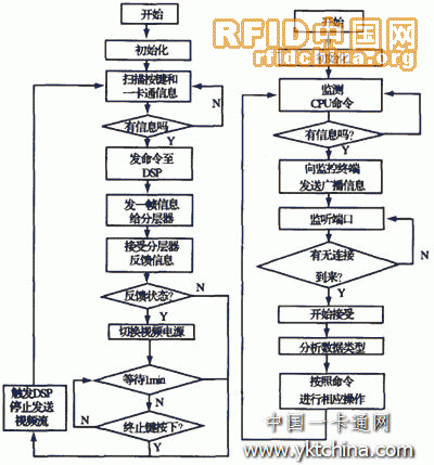 對于底層軟件,主要是門口終端的控制軟件,其工作流程如圖5所示。門口終端上電后,先進(jìn)行初始化工作,然后開始掃描按鍵和一卡通信息,當(dāng)確認(rèn)有變化時(shí),微處理器CPU l先給分層器發(fā)送一幀信息,并且監(jiān)聽分層器的反饋信息,同時(shí)啟動(dòng)DSP通過網(wǎng)絡(luò)端口發(fā)送廣播消息給監(jiān)控終端,以便啟動(dòng)監(jiān)控終端的接受線程接受視頻流和訪問信息或一卡通信息。當(dāng)時(shí)間超過l min或終止鍵按下時(shí),雙方終止通信,門口終端與監(jiān)控終端之間由CPU1觸發(fā)DSP中斷,使其停止發(fā)送視頻流數(shù)據(jù)。