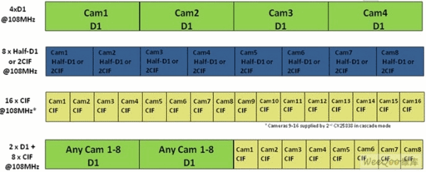 CX25838為監(jiān)控DVR設(shè)計(jì)人員提供機(jī)會,通過提供幀交錯(cuò)數(shù)據(jù)實(shí)現(xiàn)編解碼器效率最大化,而不采用昂貴的FPGA或可編程邏輯。它還通過提供各種分辨率和幀速率,在一系列產(chǎn)品*享系統(tǒng)架構(gòu),提供規(guī)模優(yōu)勢的能力。例如,低成本DVR可采用一個(gè)編解碼器以全幀速率壓縮16個(gè)CIF分辨率通道,這可通過一條8位總線實(shí)現(xiàn)。其他解決方案可能需要每個(gè)編解碼器以全幀速率壓縮4個(gè)D1分辨率通道。還有些可能需要降低幀速率的D1