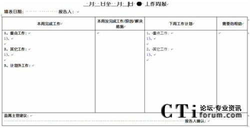 用于各級(jí)管理人員填寫(xiě)匯報(bào)工作周總結(jié),同時(shí)也是與上一級(jí)的一種溝通渠道。