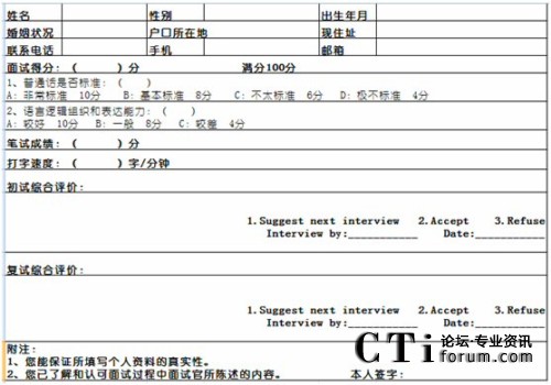 用于對(duì)新員工面試情況的評(píng)估記錄,包括面試的結(jié)果,須進(jìn)入員工管理檔案。