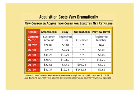 上世紀(jì)90年代末期DOT.COM就遭遇了這一嚴(yán)峻問(wèn)題。70% - 80%的客戶在沒(méi)有完成采購(gòu)之前就棄網(wǎng)站而去。對(duì)于許多人來(lái)說(shuō)這被認(rèn)為是一個(gè)“行業(yè)基準(zhǔn)”,屬于可接受水平,但也有些人開(kāi)始尋找解決方案。整個(gè)行業(yè)開(kāi)始注意到分析家們的忠告:這一水平的放棄率是不被允許的。下面這張由Yankee集團(tuán)在2000年發(fā)布的表格向我們展示了電子商務(wù)企業(yè)客戶獲取成本螺旋形盤(pán)升的過(guò)程。