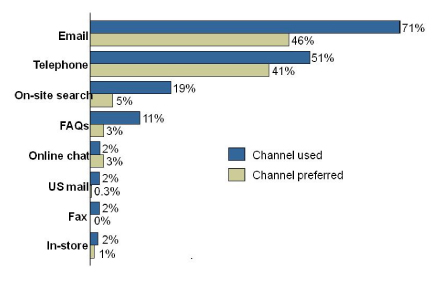 正是基于這一點(diǎn)供應(yīng)商們紛紛加入PeopleSupport的陣營(yíng),并且在這之后不久統(tǒng)一的排隊(duì)技術(shù)就問(wèn)世了,更在之后發(fā)展成全面集成的聯(lián)絡(luò)中心解決方案和eCRM套件。這些系統(tǒng)允許聯(lián)絡(luò)中心將電話流與交談、電子郵件、郵寄信件和傳真混合起來(lái),現(xiàn)在,SMS也來(lái)了。Forrester調(diào)研機(jī)構(gòu)2005年進(jìn)行了一個(gè)調(diào)研,意在檢測(cè)客戶偏愛(ài)的聯(lián)絡(luò)渠道有哪些以及他們實(shí)際使用的渠道又是哪些。該調(diào)研貫穿全美所有類型的企業(yè)(并不局限于電子零售商或DOT.COM們)