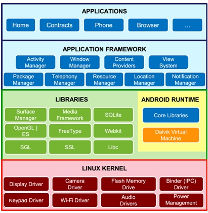 應(yīng)用程序(Application):所有Android應(yīng)用程序皆是以Java程序語(yǔ)言編寫(xiě),原始就會(huì)包含像是Email、簡(jiǎn)訊、日歷、地圖、瀏覽器、聯(lián)絡(luò)人等其它應(yīng)用程序,讓用戶(hù)一開(kāi)始就擁有這些基本功能,開(kāi)發(fā)者也可在此客制其使用接口。