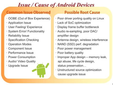 盡管Android系統(tǒng)的普及看似指日可待,但在實(shí)際的產(chǎn)品應(yīng)用上,也有其可能產(chǎn)生的問(wèn)題風(fēng)險(xiǎn)。Android作為一個(gè)開(kāi)放式的操作系統(tǒng),是Google提供廠商的操作系統(tǒng)參考架構(gòu)(reference design),廠商能有充足的發(fā)揮空間,以Android為基礎(chǔ)向上開(kāi)發(fā)設(shè)計(jì)自家產(chǎn)品,但也因?yàn)檫@樣的開(kāi)放性與自由性,讓廠商在軟硬件結(jié)合的這個(gè)環(huán)節(jié)必須下更大的功夫,像是如何挑選合適的硬件包括基頻處理器、通信芯片、觸控感應(yīng)芯片、天線與存儲(chǔ)器模組等,以及如何調(diào)整出最適當(dāng)?shù)能浖O(shè)定等,更重要的是如何將軟硬件整合,開(kāi)發(fā)出差異化的產(chǎn)品。這中間所有的細(xì)節(jié)都會(huì)對(duì)產(chǎn)品最終樣貌產(chǎn)生莫大的影響,像是其功能的完整度、使用接口的設(shè)計(jì)、效能表現(xiàn)(例如觸控滑動(dòng)畫(huà)面、開(kāi)啟程序所需時(shí)間)、品質(zhì)可靠度、甚至是后續(xù)的固件升級(jí)動(dòng)作等等。在此百佳泰便試圖以專(zhuān)業(yè)中立的測(cè)試實(shí)驗(yàn)室角度,來(lái)點(diǎn)出廠商應(yīng)用Android于手機(jī)、平板電腦或其他設(shè)備時(shí)應(yīng)注意的開(kāi)發(fā)重點(diǎn),以希冀作為一個(gè)有效的參考資訊。