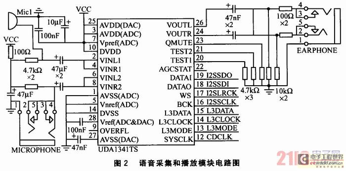 語(yǔ)音采集和播放模塊的作用是將音頻模擬信號(hào)轉(zhuǎn)換為數(shù)字信號(hào),并對(duì)信號(hào)進(jìn)行PCM編碼。其電路如圖2所示。采用Philips公司的UDA1341 TS型立體聲音頻CODEC進(jìn)行音頻編解碼。該芯片提供2個(gè)麥克風(fēng)輸入,可實(shí)現(xiàn)單端輸入、差分輸入等靈活配置,并設(shè)置了可編程增益放大器和自動(dòng)增益控制器,可保證高質(zhì)量的音頻獲。煌瑫r(shí),還集成了聽筒和喇叭輸出的驅(qū)動(dòng)器,喇叭音量可以通過(guò)編程調(diào)整。S3C2440A-40微處理器與UDA1341TS編解碼器通過(guò)I2S總線直接相連,并采用DMA發(fā)送/接收方式,完成系統(tǒng)的錄音和放音。