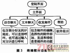 用戶打開終端軟件,可以根據(jù)自己的需要選擇語(yǔ)音聊天、文本聊天或者收發(fā)郵件。進(jìn)行語(yǔ)音聊天前,用戶可以直接在好友欄中選擇聊天對(duì)象,也可直接輸入對(duì)方的IP進(jìn)行連接。語(yǔ)音聊天的過(guò)程是:說(shuō)話方,麥克風(fēng)采集模擬語(yǔ)音信號(hào)→語(yǔ)音芯片采集量化編碼→嵌入式系統(tǒng)對(duì)信號(hào)進(jìn)行壓縮編碼→RTP格式打包→UDP格式打包→IP格式打包→Internet網(wǎng)絡(luò)傳輸;收聽方,接收語(yǔ)音數(shù)據(jù)→去IP/UDP/RTP包頭→嵌入式系統(tǒng)對(duì)信號(hào)解碼→語(yǔ)音芯片將數(shù)字語(yǔ)音信號(hào)轉(zhuǎn)為模擬信號(hào)→揚(yáng)聲器播放。