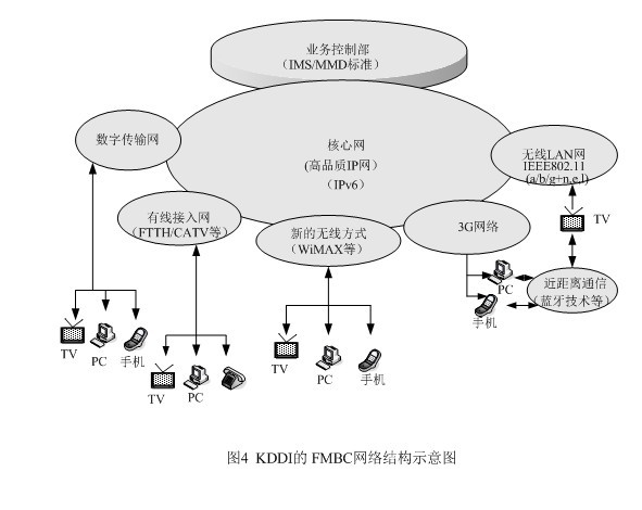 為了在市場(chǎng)競爭中立于不敗之地,KDDI另辟稀徑,提出了將固定網(wǎng)、移動(dòng)網(wǎng)、因特網(wǎng)和電視廣播相融合的概念,它與朝日新聞、朝日電視簽署合作框架,就是它的集中代表。FMBC是超3G的構(gòu)想,是以移動(dòng)通信為基礎(chǔ),與固定電話網(wǎng)及因特網(wǎng)進(jìn)行融合,現(xiàn)在又把廣播電視納入,這樣它就成了KDDI的NGN了。FMBC的網(wǎng)絡(luò)結(jié)構(gòu)請(qǐng)見圖4。從圖4上不難發(fā)現(xiàn)NGN的影子,特別是業(yè)務(wù)控制部的設(shè)立,并采用ISM/MMD標(biāo)準(zhǔn),將網(wǎng)絡(luò)與應(yīng)用分開,以利新業(yè)務(wù)的開拓,同時(shí)完成核心網(wǎng)的IP化,這些都是NGN的基本概念。