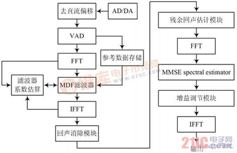 系統(tǒng)采用了頻域的MDF 自適應(yīng)濾波算法,將MMSE No ise Suppresso r 和多個(gè)VAD 添加到回聲消除器中。在加入濾波器系數(shù)更新模塊和非線性檢測(cè)模塊后,使得系統(tǒng)在更惡劣的噪音環(huán)境下以及雙方通話過(guò)程中,一樣具備良好的回聲消除和噪音消除能力。整個(gè)核心運(yùn)算部分均在頻率域內(nèi)完成,也大大降低了運(yùn)算量,最后通過(guò)調(diào)整DSP 的數(shù)據(jù)結(jié)構(gòu),合理運(yùn)用DSP 的資源和指令加速,實(shí)現(xiàn)了基于DSP 的高效能實(shí)時(shí)音頻處理器的設(shè)計(jì)。