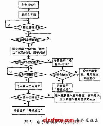 如圖2所示,電子鎖原始密碼和用戶設(shè)定密碼已存于外部存儲器E2PROM內(nèi),用戶要開門需先用電子感應(yīng)鑰匙開RFID碼感應(yīng)鎖,當(dāng)感應(yīng)鎖成功開鎖時(shí),系統(tǒng)將發(fā)出語音提示“感應(yīng)鎖開鎖成功”,然后輸入先前設(shè)定的密碼,密碼正確后,系統(tǒng)發(fā)出語音提示“開鎖成功”,否則提示“輸入密碼錯(cuò)誤”。輸入密碼三次以上錯(cuò)誤,系統(tǒng)將報(bào)警并自鎖30 min。整個(gè)開鎖時(shí)間不能超過30 s,否則系統(tǒng)發(fā)出警報(bào)聲,以防止盜賊在短時(shí)間內(nèi)利用萬能工具開鎖。系統(tǒng)待機(jī)時(shí)能在液晶上顯示時(shí)間、日期和星期等信息,實(shí)現(xiàn)友好的人機(jī)界面。