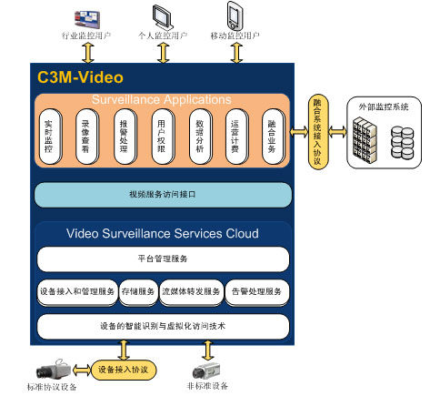 高新興通信最新推出基于云計算的C3M-Video視頻監(jiān)控管理平臺,具有視頻監(jiān)控管理平臺的通用功能和業(yè)務流程,能支持國內(nèi)外主流的視頻設備。此外,能與高新興現(xiàn)有的動力環(huán)境監(jiān)控系統(tǒng)進行深度的融合,并以此為基礎逐步演繹成一個支撐物聯(lián)網(wǎng)應用的融合監(jiān)控平臺。